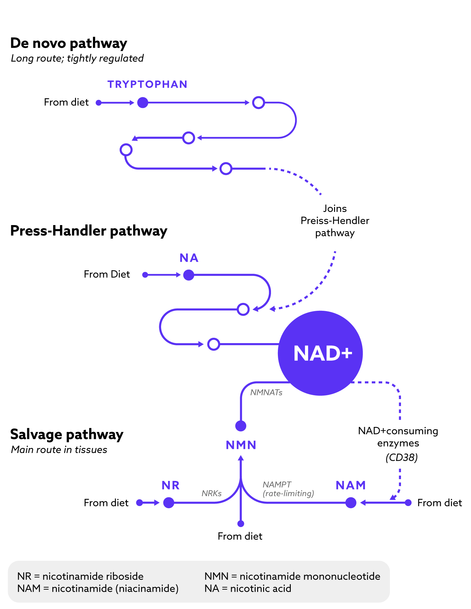 Nicotinamide riboside (NR) is a next-generation NAD⁺ precursor. Unlike traditional niacin, NR:
